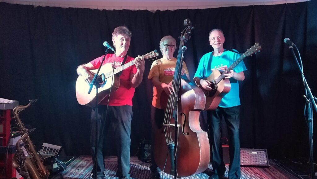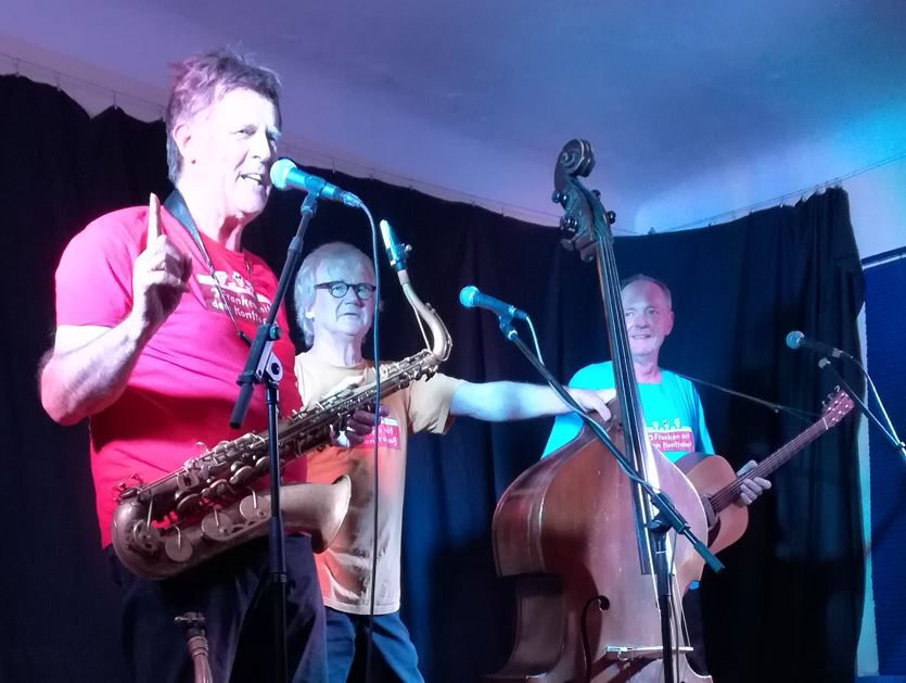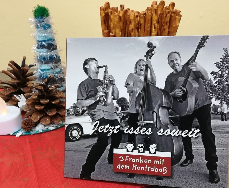 Wer gestern nicht im Bürgerzentrum war, hat wirklich etwas verpasst. Die 3 Franken mit dem Kontrabass rissen das Publikum mit ihrem 20-jährigen – Jubiläumskonzert von den Stühlen. Sozusagen unplugged gaben die 3 waschechten Franken alles – egal ob Franken-Rap, Hip-Hop mit kabarettistischen Einlagen z.B. über den *Schlussverkauf* oder den *‘Fitnessguru*. Sie waren immer auf Tuchfühlung mit dem Publikum und bezogen es aktiv mit ein. So wurde zum Beispiel das Loriot-Gedicht *Advent*zu einem kabarettistischen Highlight. Der Sprechvortrag von Kit Kiesel, der allein schon durch seine Mimik beim Vortrag die Gäste zum Lachen brachte, sowie Jag Zezula der Gitarre *vom Blatt* spielte und Ralph Stövesandt mit seiner singenden Säge, beide mit Nikolaus Mützen – das Publikum war total begeistert.